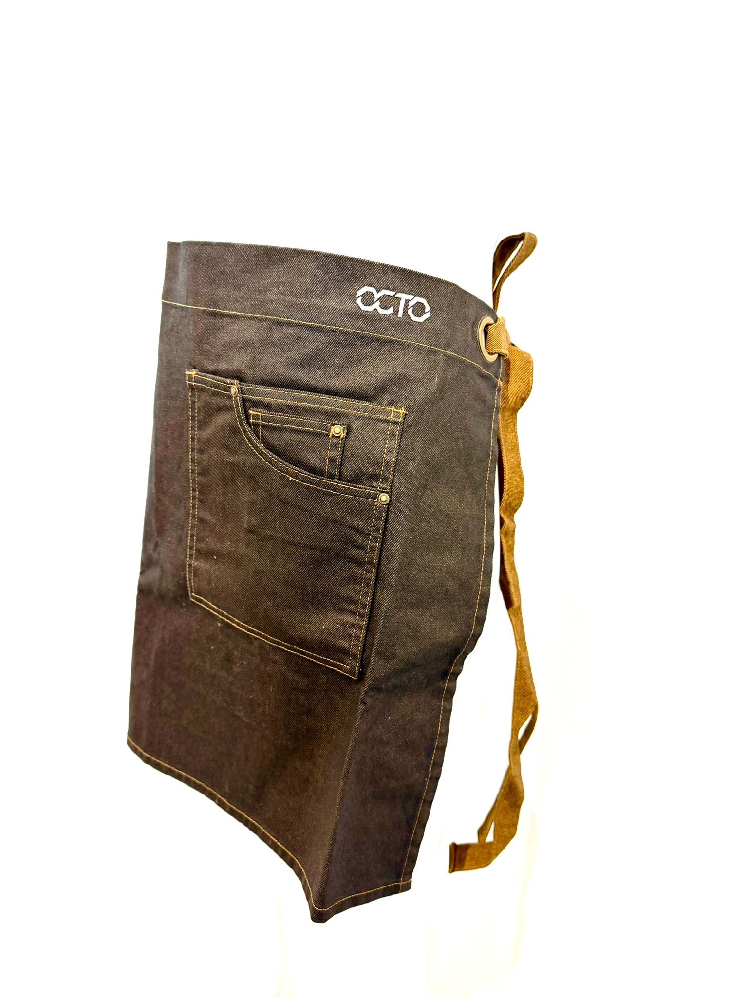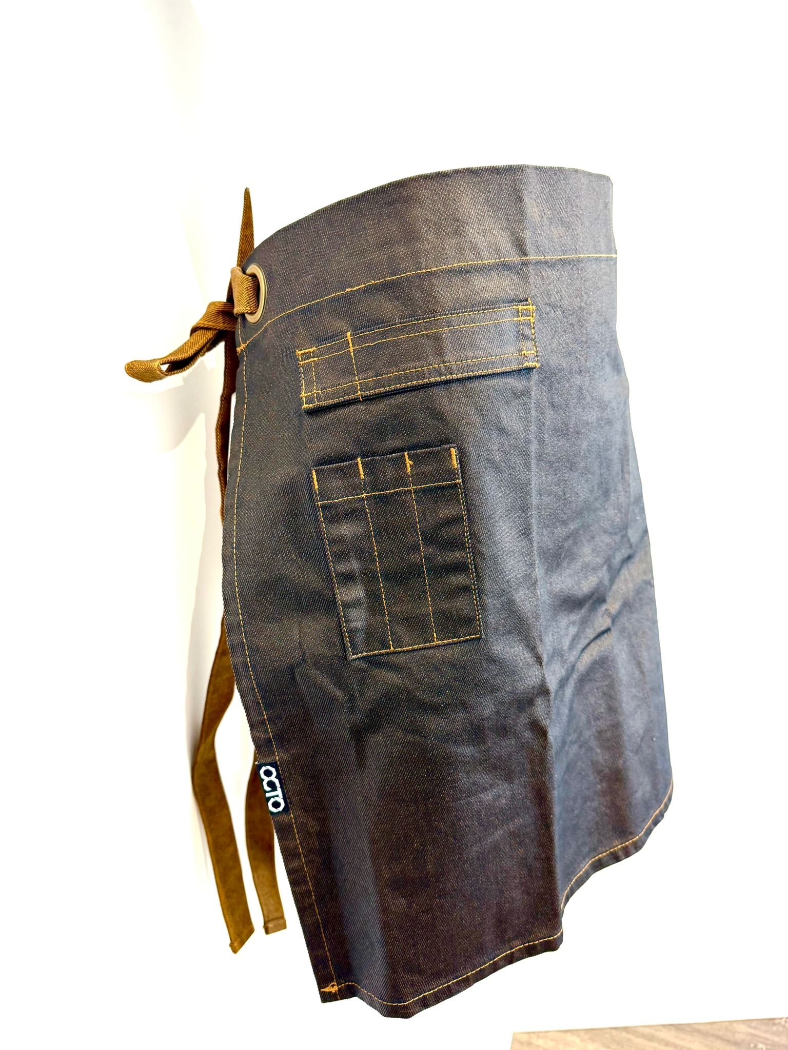 O avental de cintura é a combinação perfeita de funcionalidade e estilo. Este avental de comprimento médio é fabricado em resistente ganga de algodão com acabamento acrílico, que lhe confere uma durabilidade superior e um aspeto robusto. O seu efeito oleado acrescenta um charme industrial ao design, enquanto os detalhes como os cordões em contraste e o sistema de ilhós em metal conferem um toque de sofisticação.