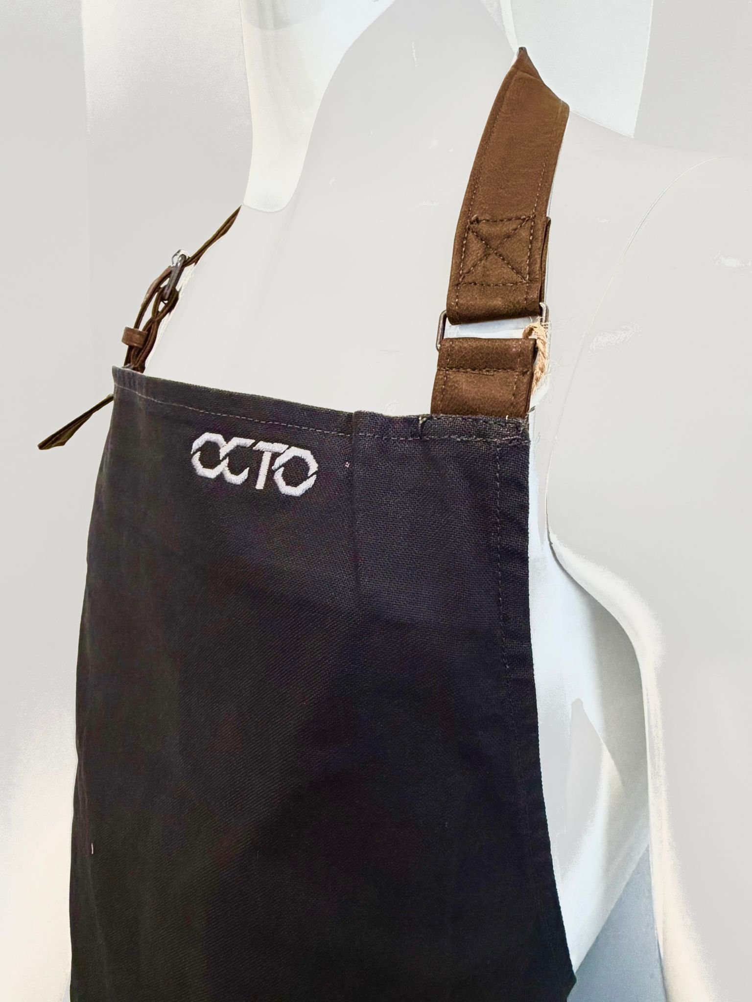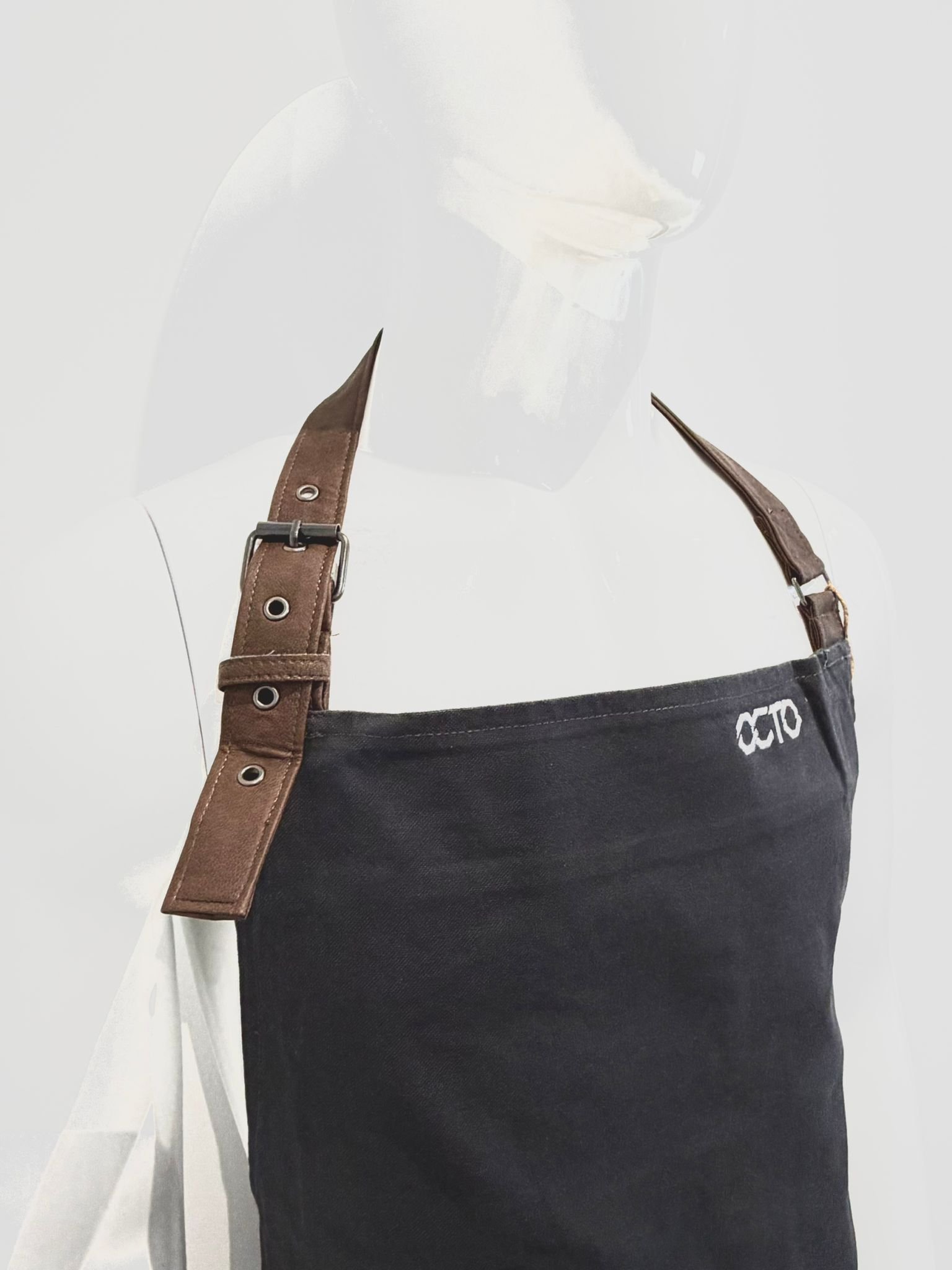 O Avental PR157 apresenta uma alça de pescoço em imitação de pele com uma fivela de ajuste, permitindo que o utilizador personalize o ajuste para o seu conforto. O suporte para pano e os ilhós em imitação de pele adicionam um toque de estilo ao design funcional do avental.
