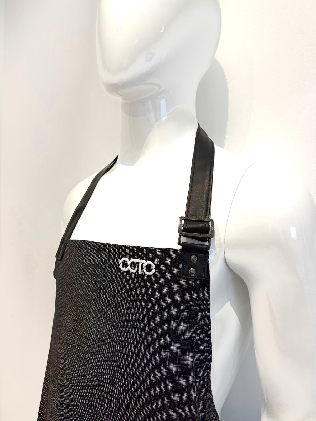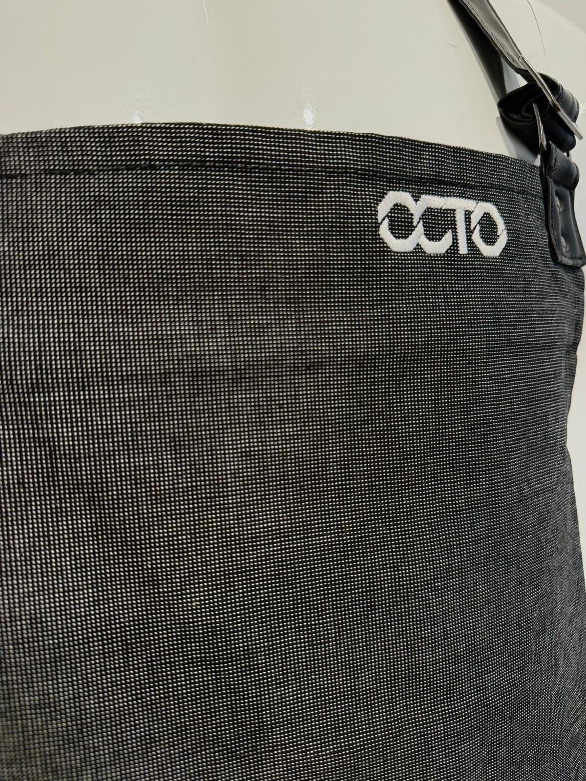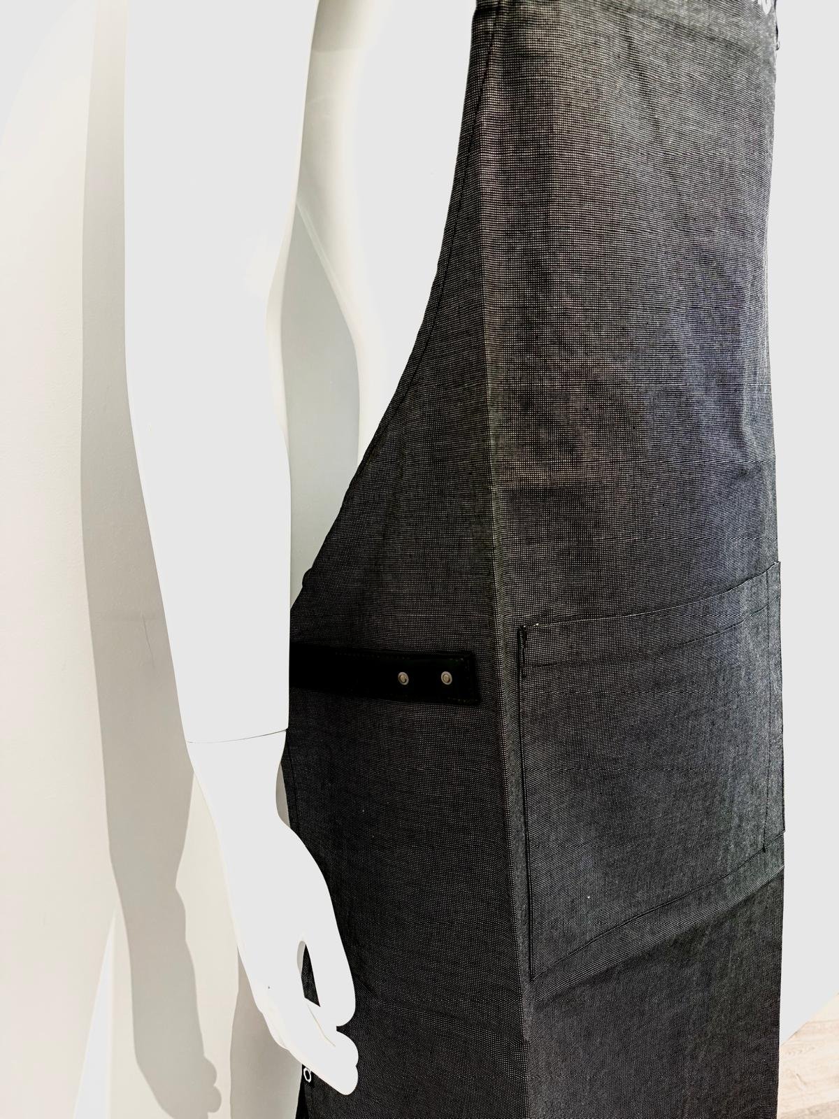100% de algodão oxford tingido. Alça de pescoço em imitação de pele com fivela de ajuste. Suporte para pano e ilhós em imitação de pele. Bolso central e bolso combinado para canetas. Cintura com presilha dupla em D. Lavagem doméstica a 60°C.